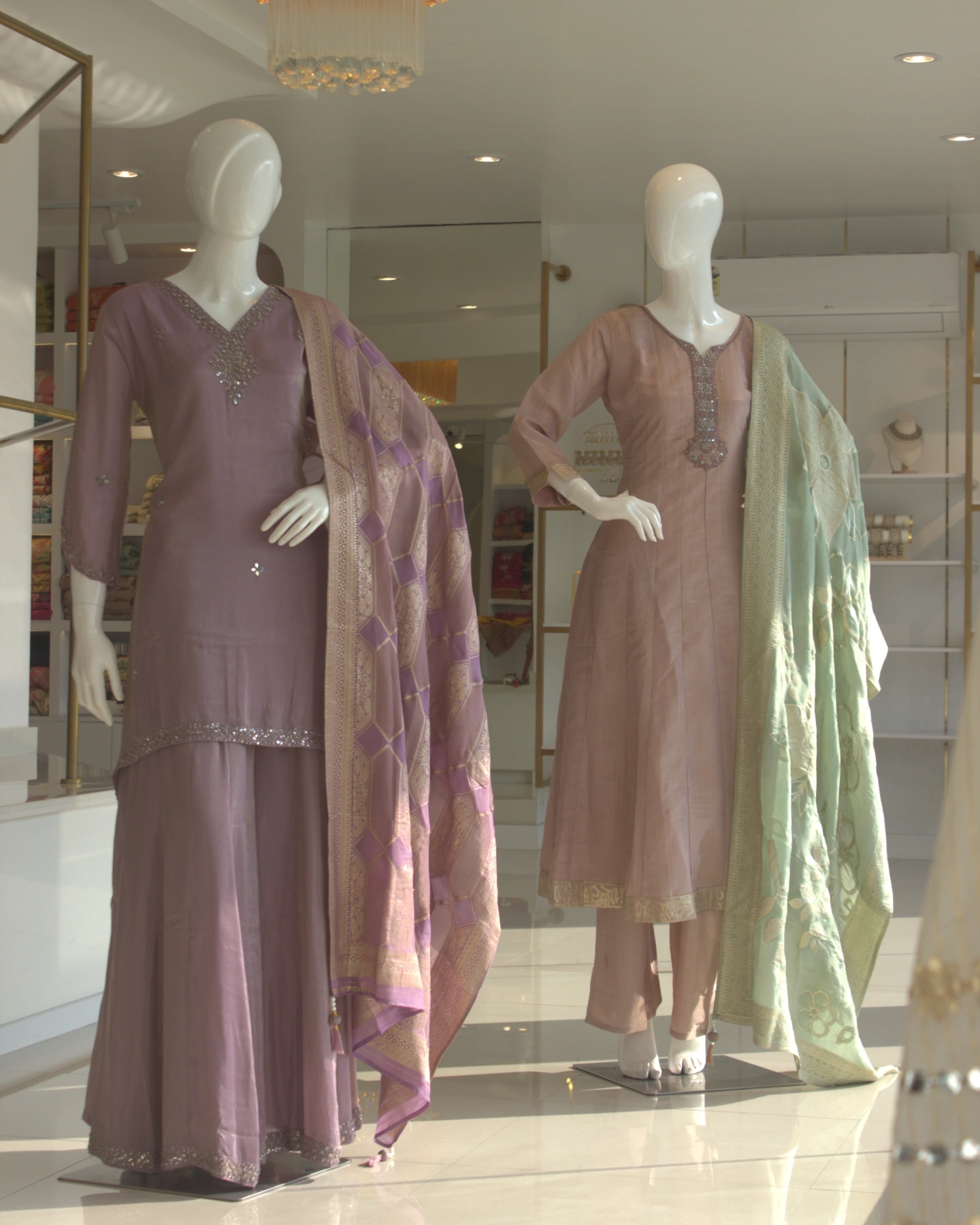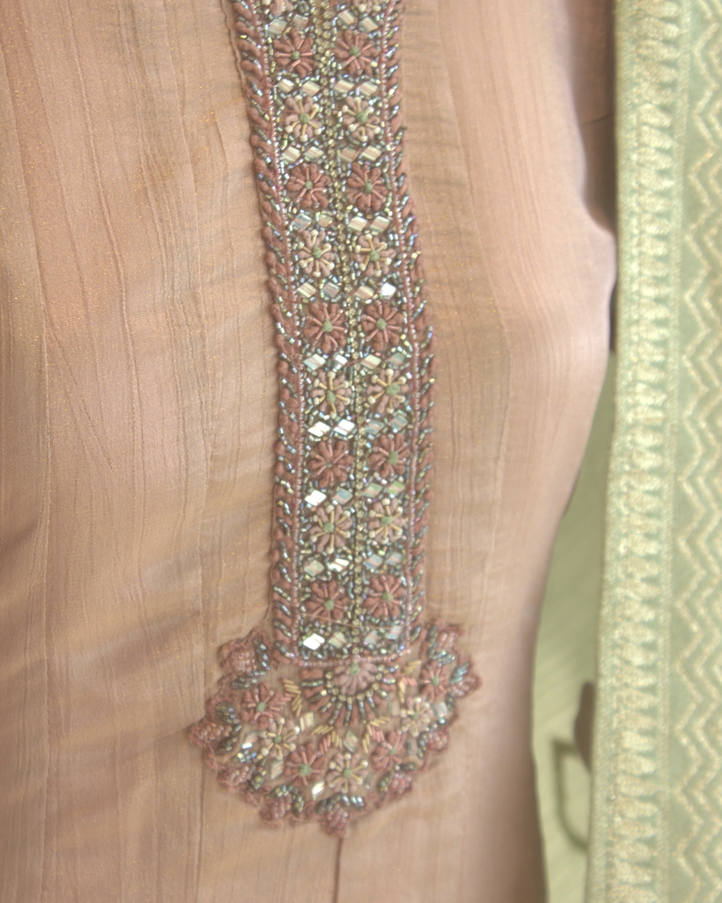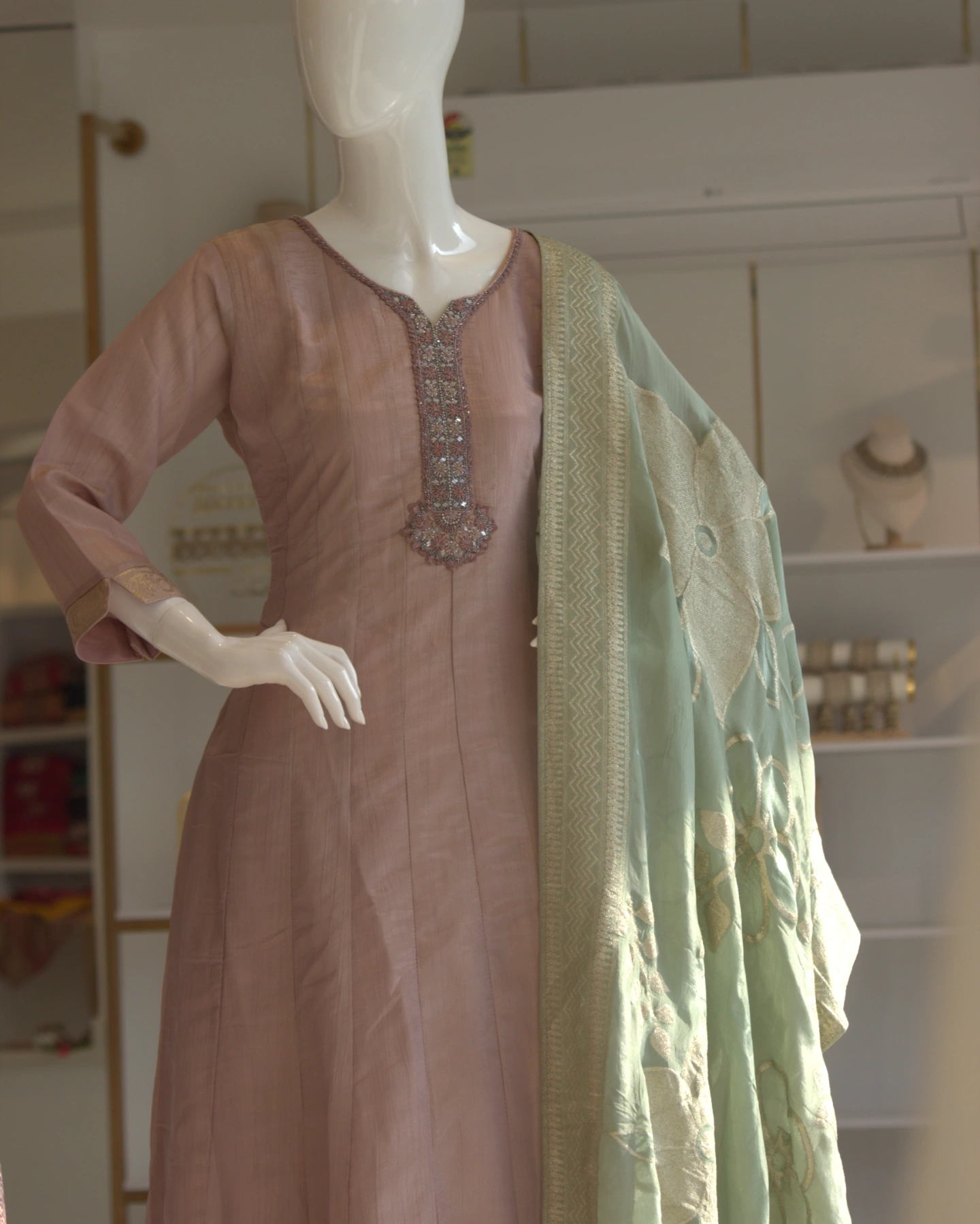 Named after shabnam — the Urdu word for morning dew — this ethereal kurtha set captures the gentle magic of the first light of day. The dusty rose base is warm, understated and effortlessly flattering, wrapping the wearer in a softness that feels both luxurious and lived-in.